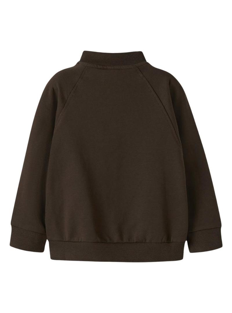 Camisola Name It. Modelo Mobie. Cor marrom. Extremidades nervuradas. Ajuste folgado. Gola alta com zíper. Manga raglan. Logo estampado na frente em relevo bege.