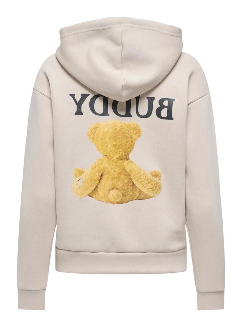 Moletom Only. Cor beige. Com capuz com laços em contraste. Estampa de urso no peito e nas costas. Manga comprida. Corte regular. Ombros caídos. O modelo veste tamanho S.