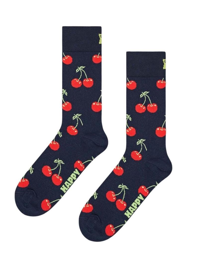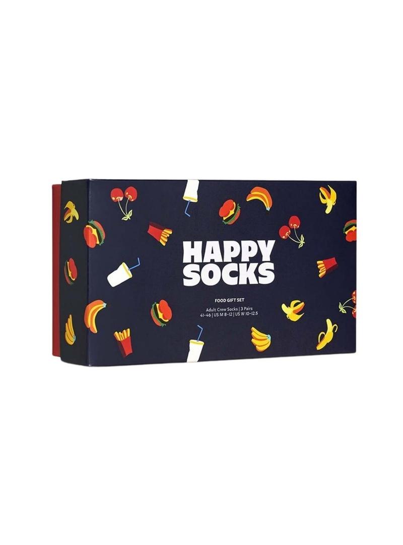 Caixa de presente Happy Socks. Contém três pares de meias. Cor preta com estampa de Fast Food. Cor azul marinho com estampa de cerejas. Cor azul marinho com estampa de bananas. Cano alto. Parte superior canelada. Ajuste perfeito que as mantém no lugar.