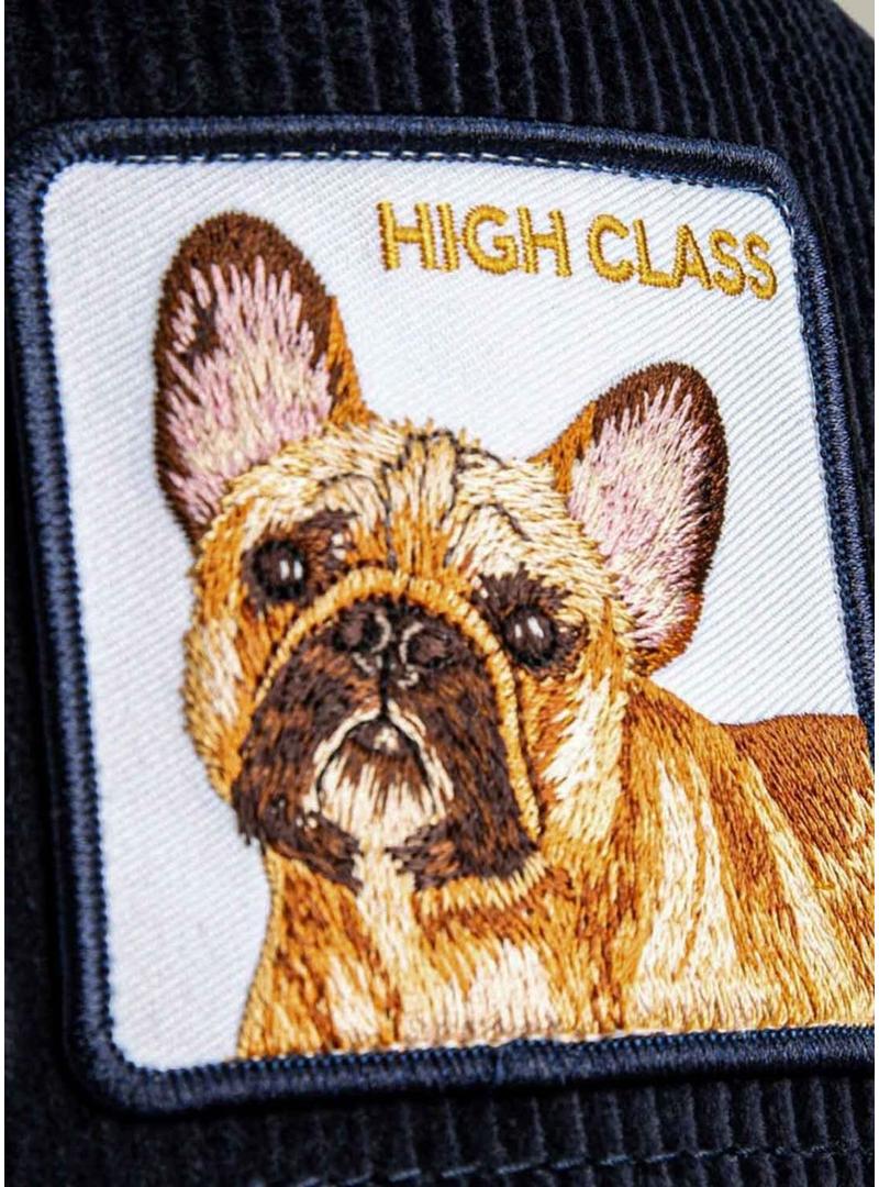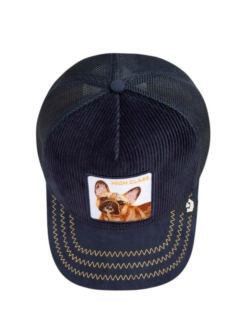 Boné Goorin Bros. Modelo High Class. Cor azul marinho. Frente de veludo cotelê. Viseira com costuras em amarelo contrastante. Parte de trás em malha. Fita ajustável na parte de trás. Etiqueta lateral da marca. Patch de Bulldog Francês bordado na frente.