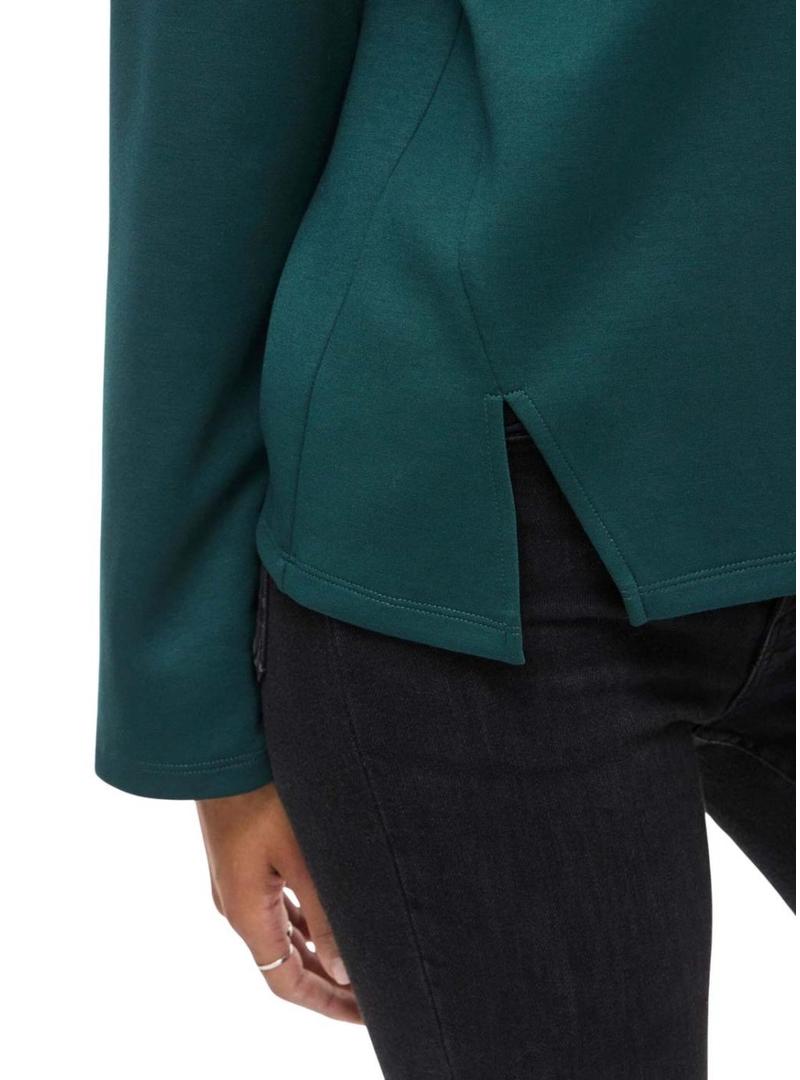 Moletom Vila. Cor verde. Manga comprida. Gola redonda. Ombros caídos. Detalhes de aberturas na parte da frente. Tecido macio. Formato regular. O modelo veste o tamanho S.