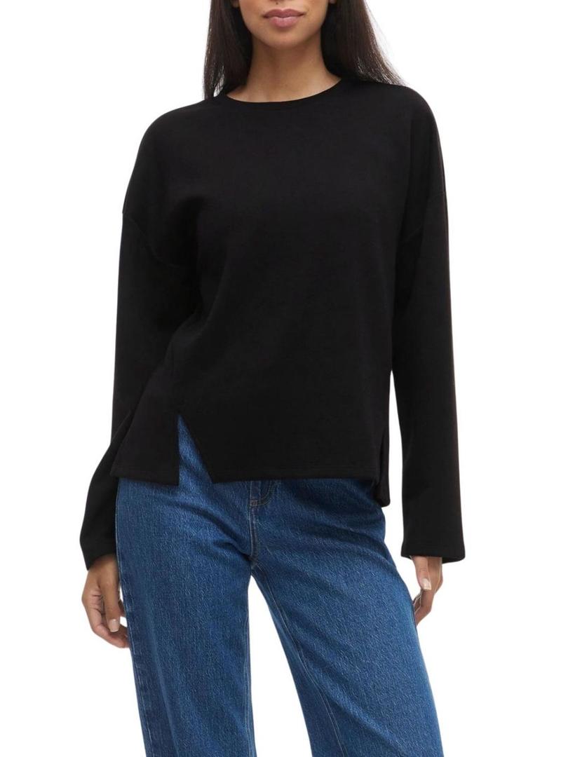 Moletom Vila. Cor preta. Manga comprida. Gola redonda. Ombros caídos. Detalhes de aberturas. Tecido suave. Corte regular. A modelo veste o tamanho S.