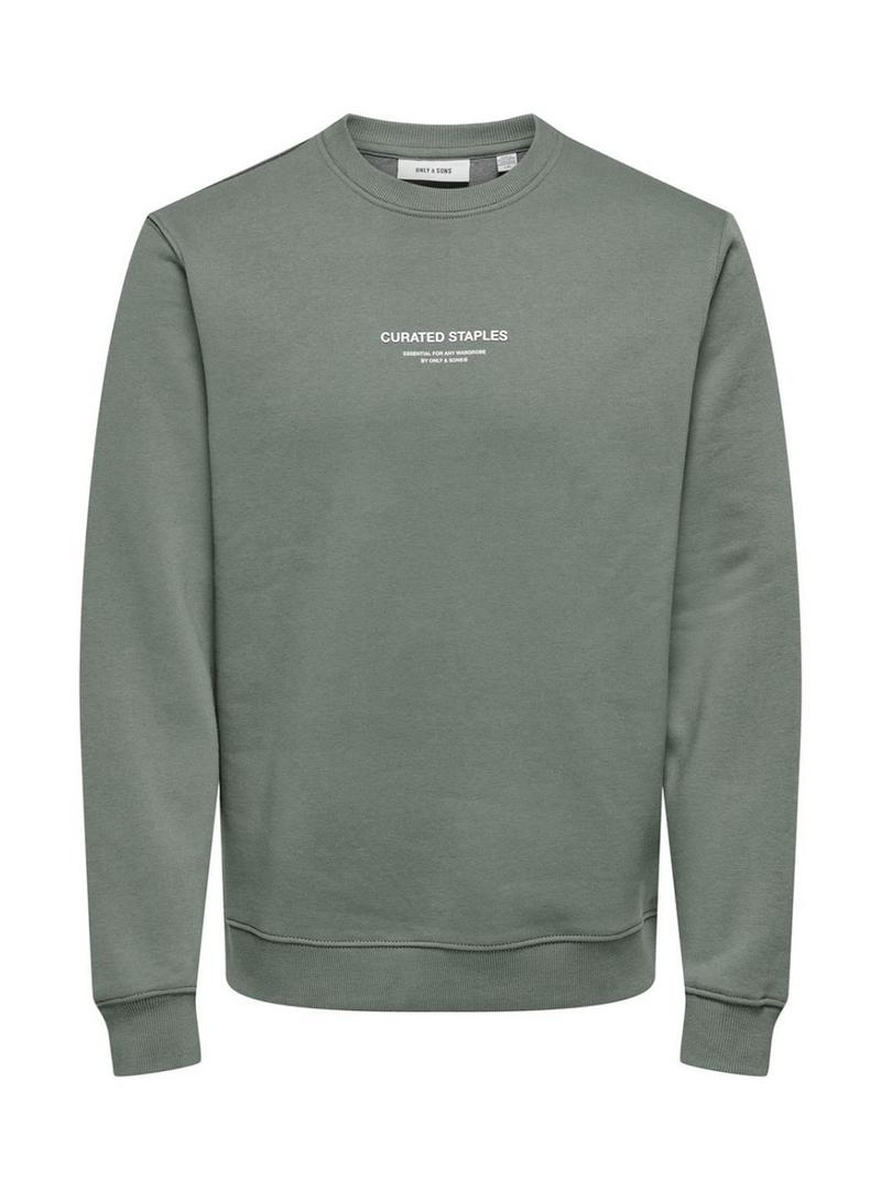 Moletom Only and Sons. Cor verde. Gola redonda. Manga comprida. Formato regular. Texto estampado no peito. Acabamentos canelados. O modelo veste tamanho M.