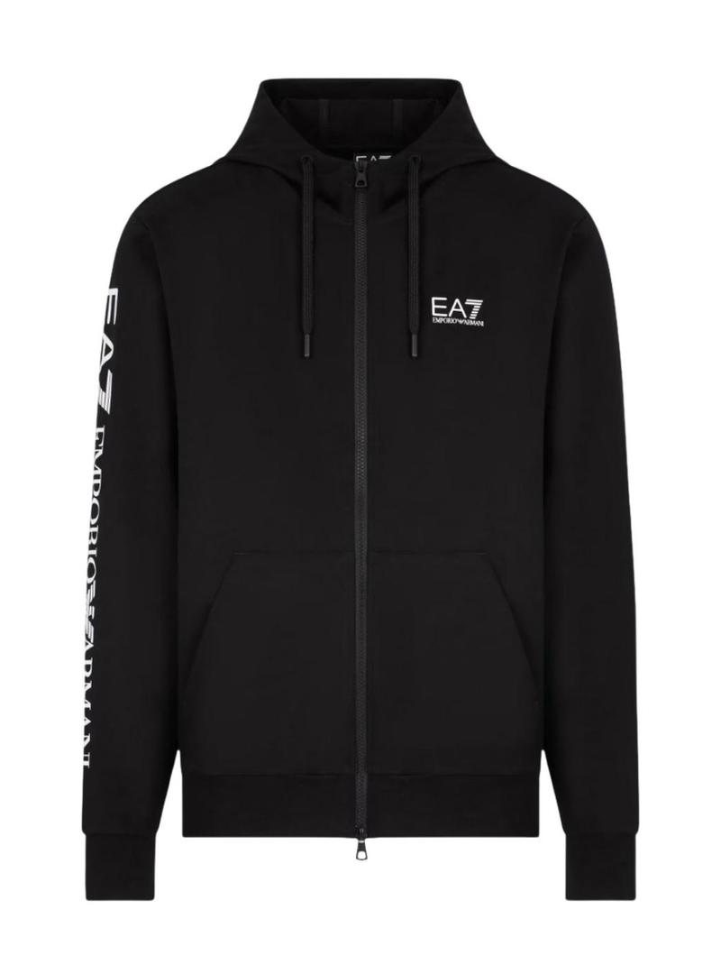 Moletom Emporio Armani EA7. Cor preta. Com capuz. Manga comprida. Fecho com zíper. Logotipo EA7 em destaque no peito e em uma manga. Bolsos laterais. O modelo veste tamanho L.