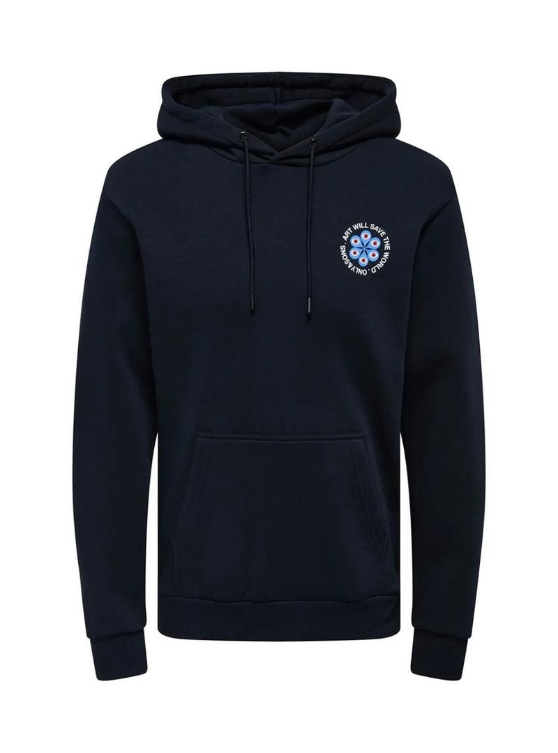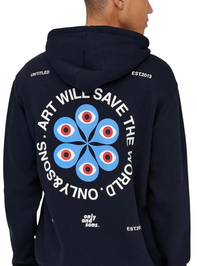 Moletom Only and Sons. Cor preta. Capuz ajustável com cordões. Manga comprida. Formato regular. Bolso canguru. Ilustração estampada no peito e nas costas. Mensagem Art will save the world.