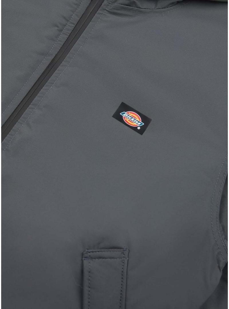 Jaqueta Dickies. Modelo Sarpy. Cor cinza. Fechamento frontal com zíper. Tecido resistente à água. Bolsos laterais. Um bolso interno. Logotipo da marca no peito. Com capuz. Corte reto. Bainha com elástico.