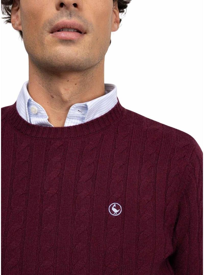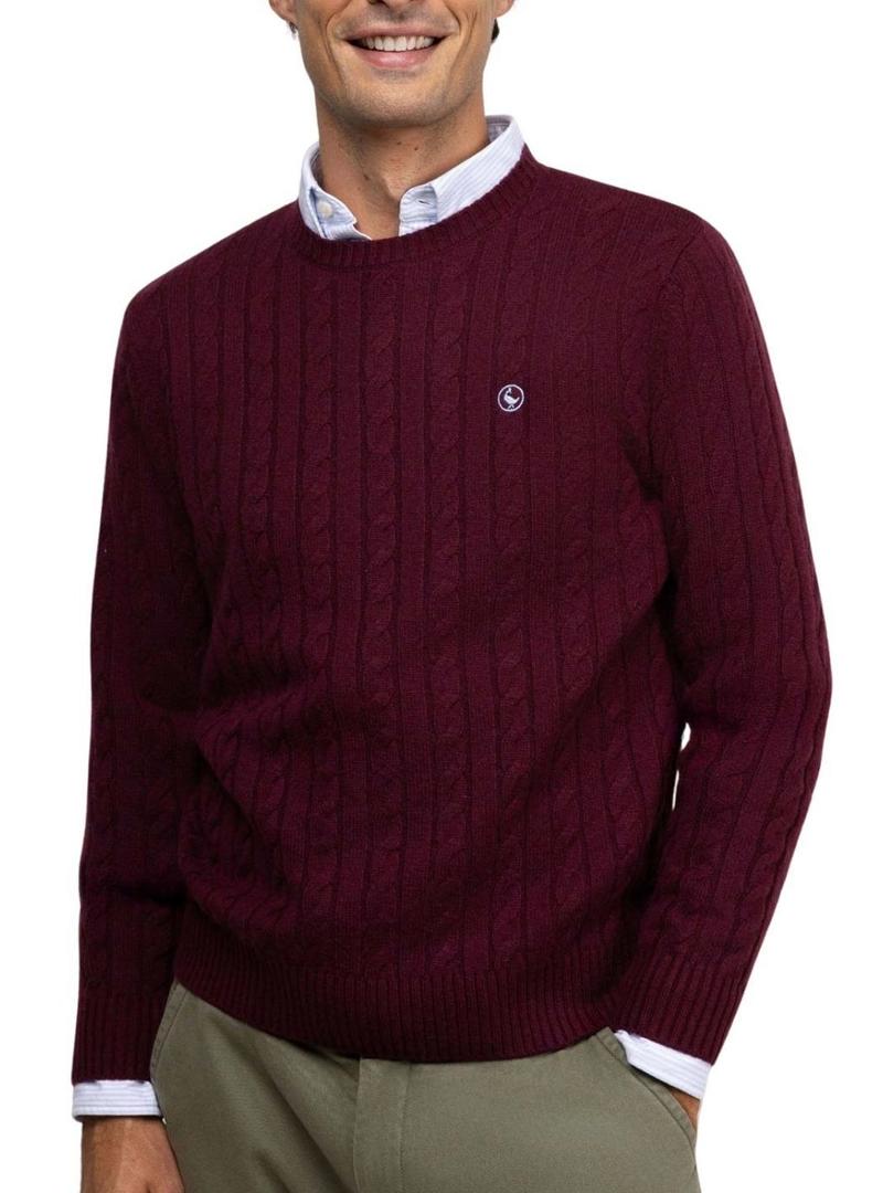 Camisola El Ganso. Cor granada. Tecido de lã. Ponto de trança. Gola redonda. Logotipo bordado no peito em contraste. Acabamentos canelados. O modelo veste tamanho M.