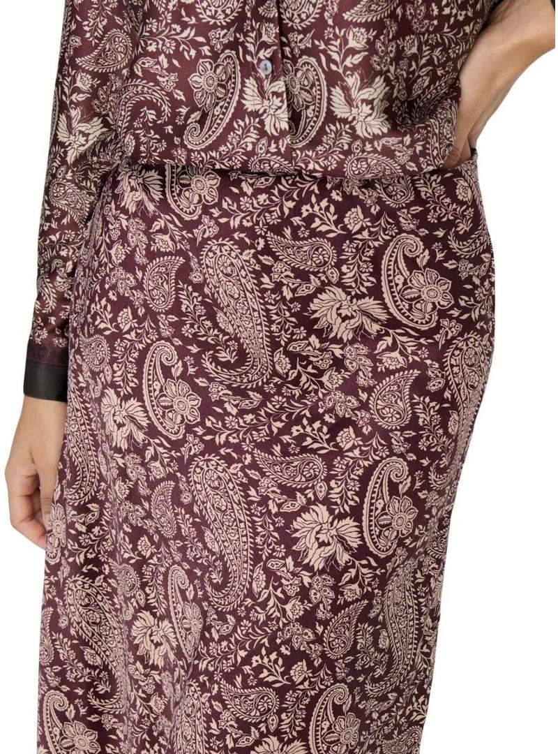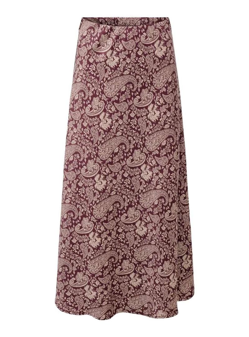 Saia Only. Cor granada. Estampa Paisley. Cintura elástica. Comprimento midi. Tecido suave. O modelo veste o tamanho S.