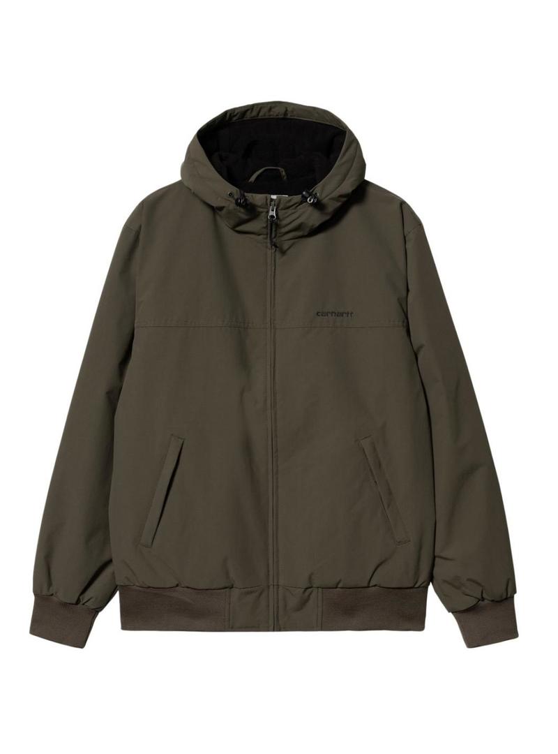 Casaco Carhartt. Cor verde. Tecido de teflon repelente à água. Interior com forro polar. Capuz ajustável. Fecho frontal com zíper. Manga comprida. Acabamentos canelados. Logotipo bordado no peito. O modelo veste o tamanho M.
