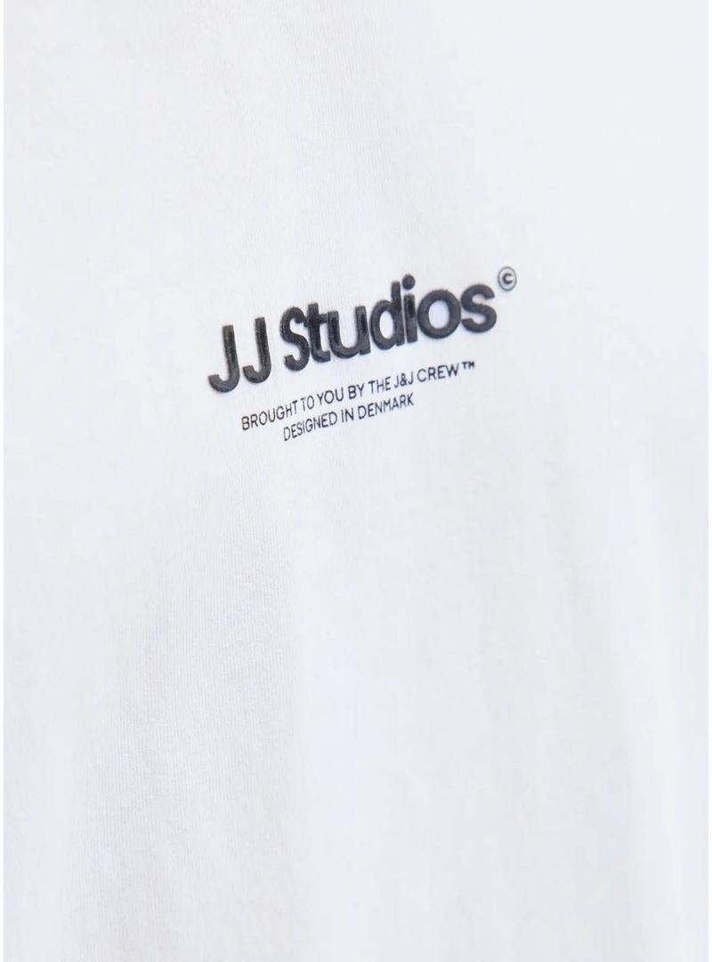 Camiseta Jack and Jones. Modelo Soho. Cor branca. Manga curta. Ajuste folgado. Gola redonda. Logo JJ Studios estampado no peito.