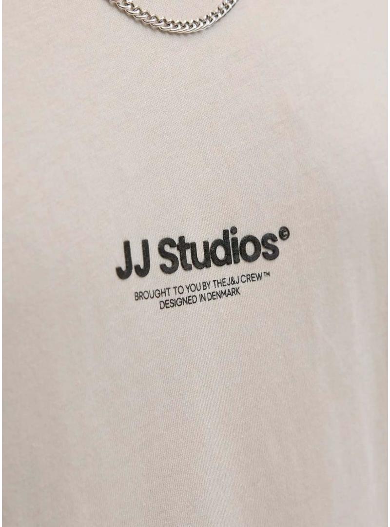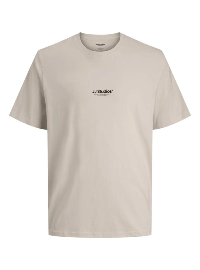 Camiseta Jack and Jones. Modelo Soho. Cor bege. Manga curta. Ajuste folgado. Gola redonda. Logo JJ Studios estampado no peito.