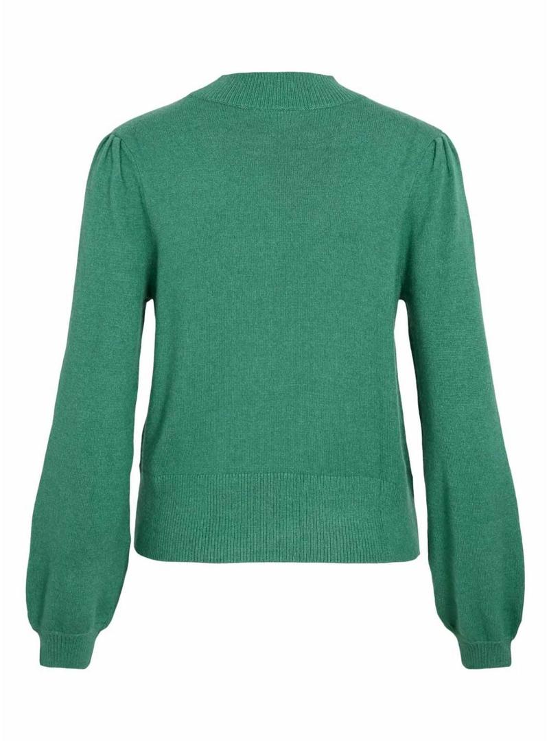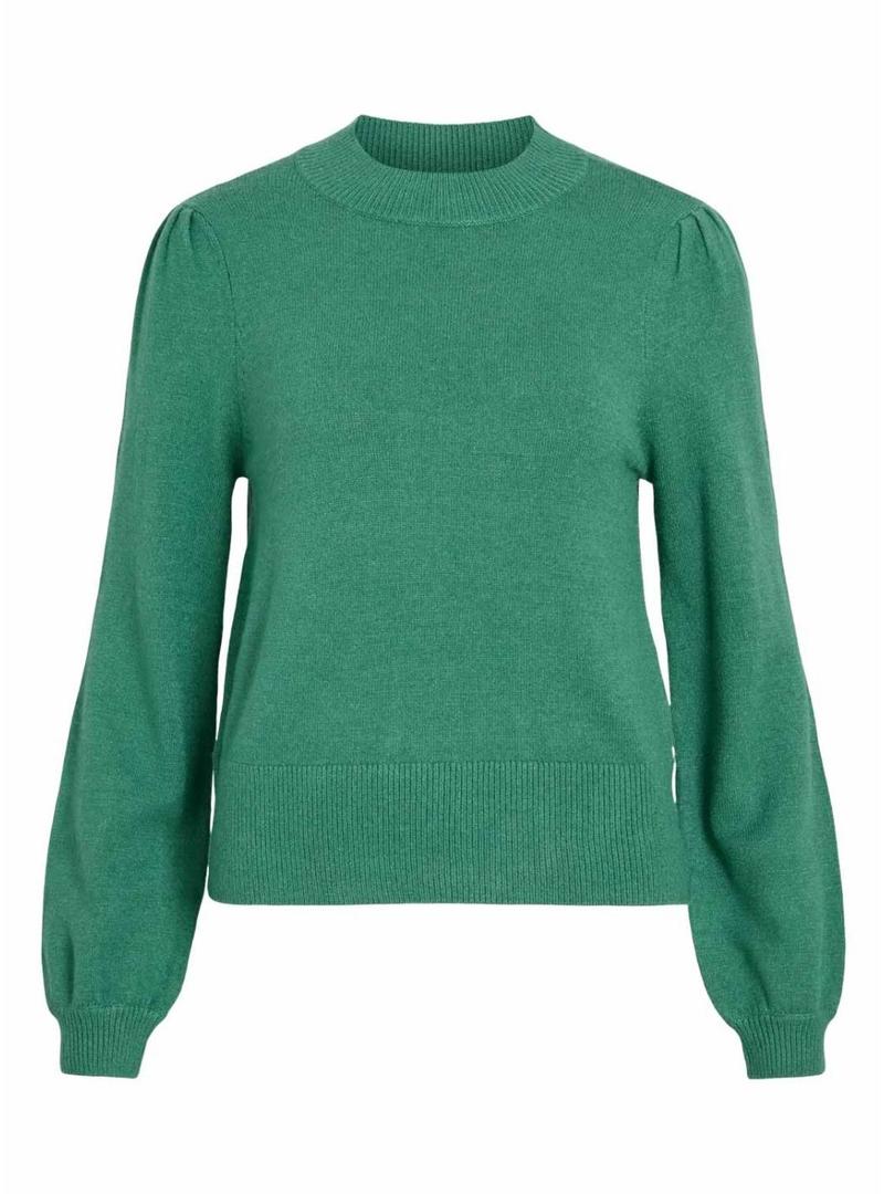 Camisola Vila. Modelo Viril. Cor verde. Gola alta. Manga comprida. Ombros franzidos. Formato regular. Acabamentos canelados. Tecido macio de malha. O modelo veste tamanho M.