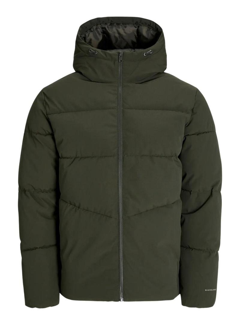 Jaqueta Jack and Jones. Modelo Global. Cor verde. Gola alta. Fecho com zíper. Capuz ajustável com elástico e cordões. Bolsos laterais. Tecido acolchoado. Estilo básico.
