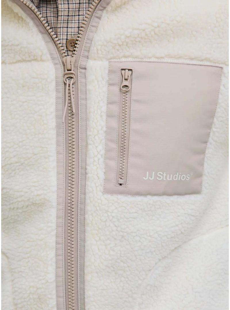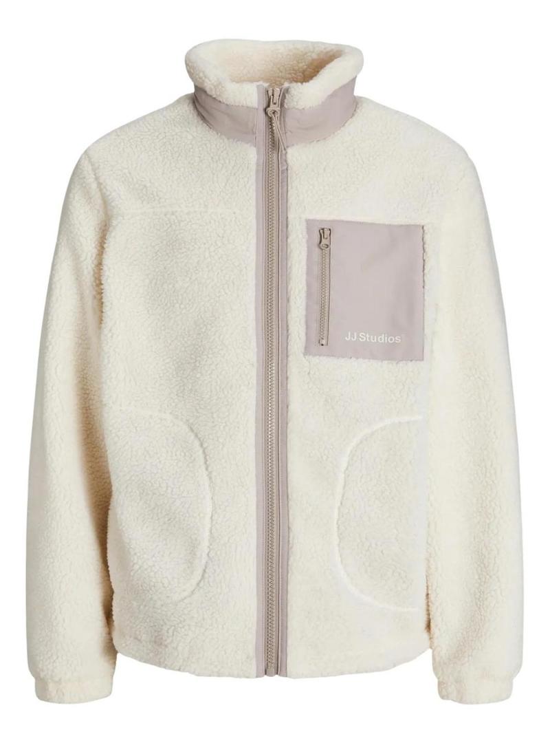 Jaqueta Jack and Jones. Modelo Soho. Cor bege. Tecido de lã de carneiro macio. Gola alta. Fecho com zíper. Bolso no peito. Detalhes em tecido de contraste. Ajuste regular. Bolsos laterais. Logo JJ Studios estampado no peito.