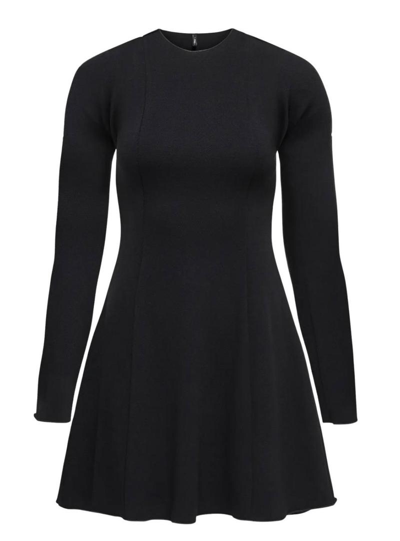 Vestido Only. Cor preta. Formato curto. Manga comprida. Gola redonda. Ajustado. Saia rodada. Costuras decorativas. O modelo veste o tamanho S.