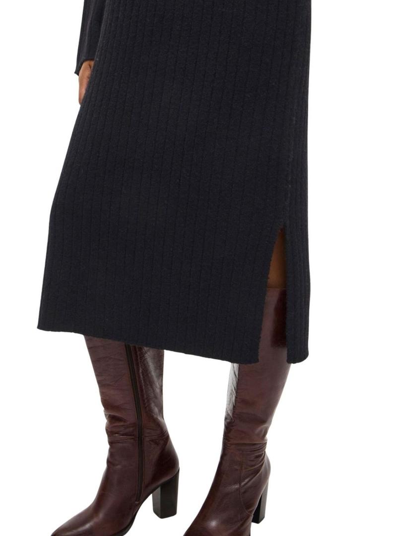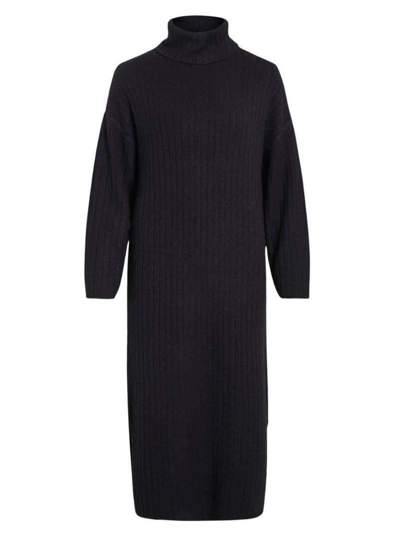 Vestido Vila. Cor preta. Comprimento midi. Tecido de malha canelada macia. Manga comprida. Gola alta. Ombros caídos. Aberturas laterais. Corte regular.