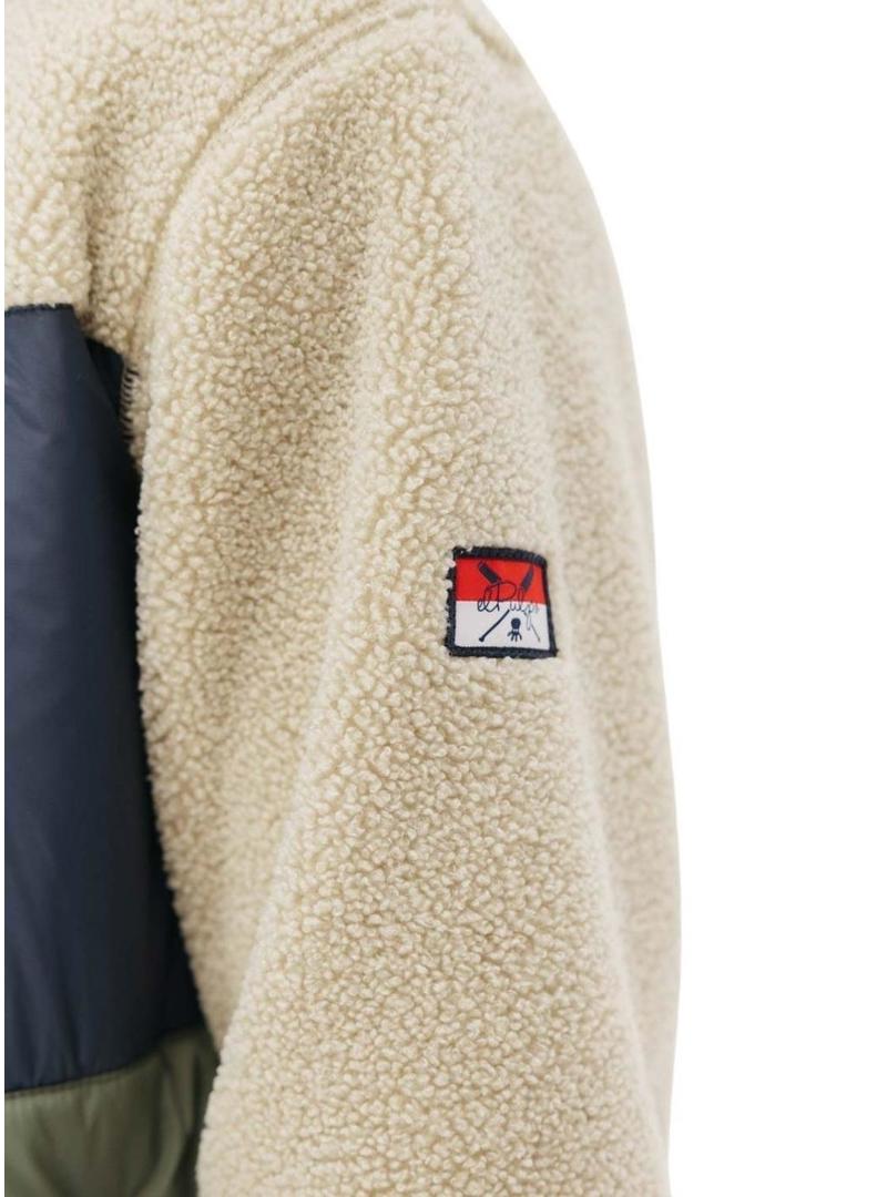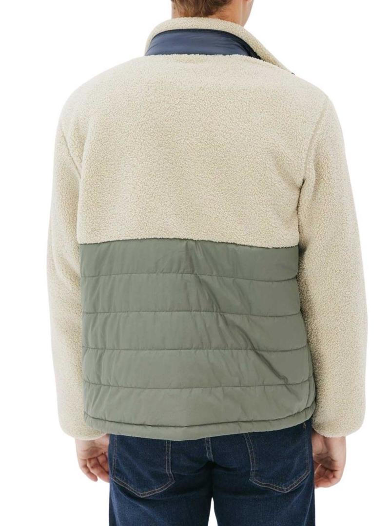Jaqueta El Pulpo. Tecido combinado de nylon e pelúcia. Cores verde, azul-marinho e bege. Manga comprida. Bolsos laterais com zíper. Bolso no peito com zíper. Corte regular. O modelo está vestindo o tamanho L.