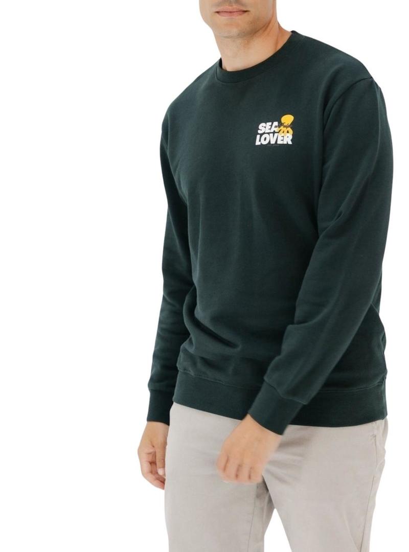 Moletom El Pulpo. Cor verde. Estampa da marca no peito. Formato relaxado. Gola redonda. Manga comprida. Três cruzes bordadas em uma manga. O modelo veste tamanho L.