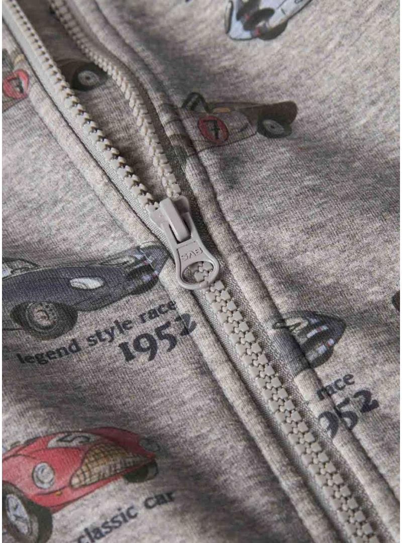Casaco Name It. Modelo Reiner. Cor cinza. Gola estilo bomber. Extremidades caneladas. Fecho com zíper. Manga comprida. Ajuste regular. Tecido estampado com carros clássicos.