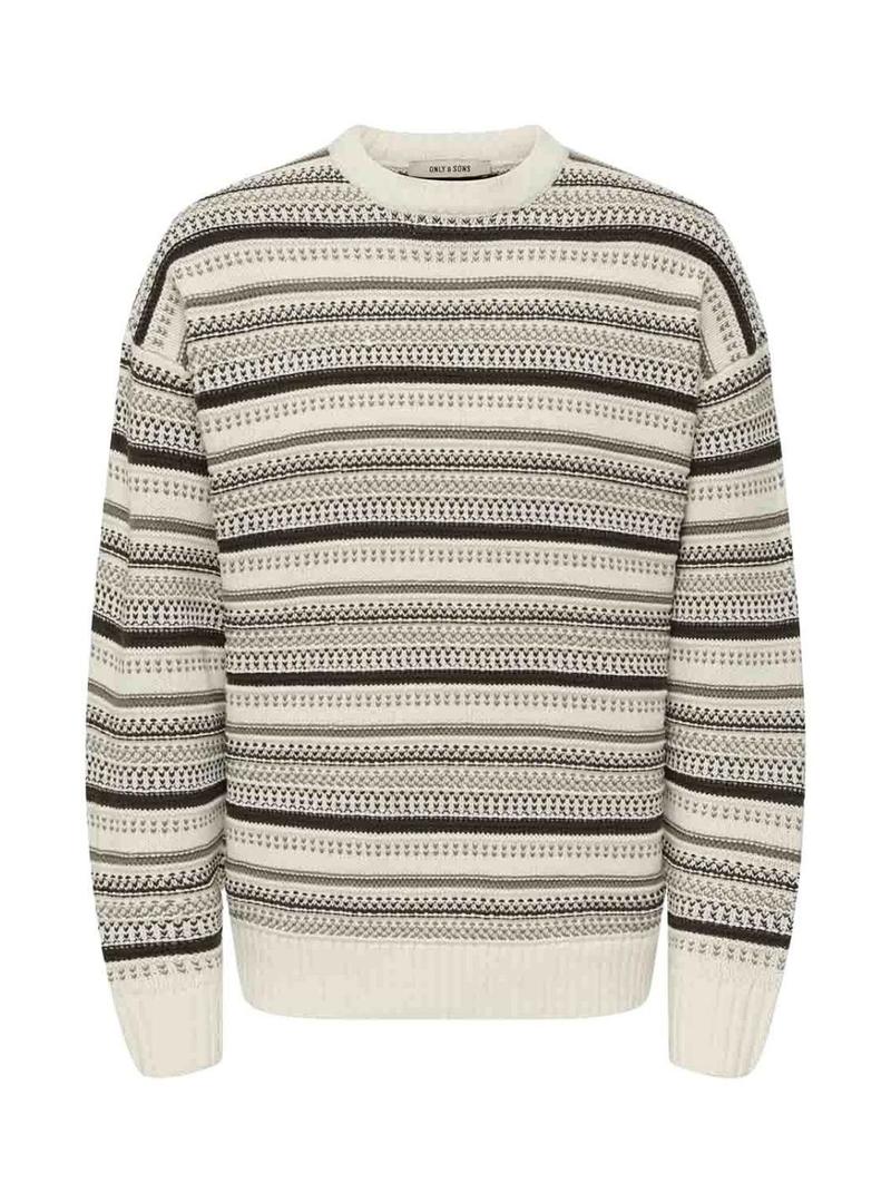Camisola Only and Sons. Cor bege. Estampa de riscas. Tecido de malha estruturada. Gola redonda. Manga comprida. Acabamentos canelados. Formato relaxado. Ombros caídos.