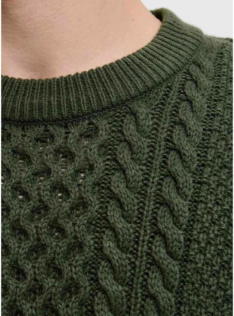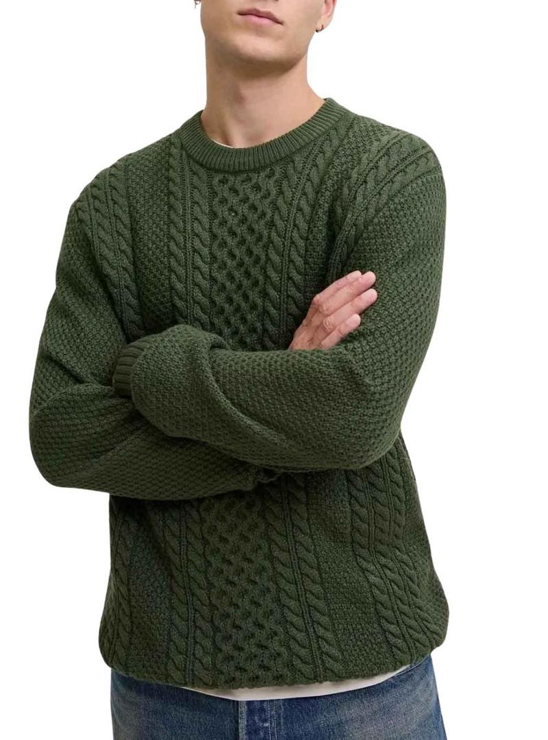 Camisola Jack and Jones. Modelo Paul. Cor verde. Corte regular. Gola redonda. Manga comprida. Acabamentos canelados. Tecido estruturado. Detalhes entrançados. O modelo veste o tamanho L.