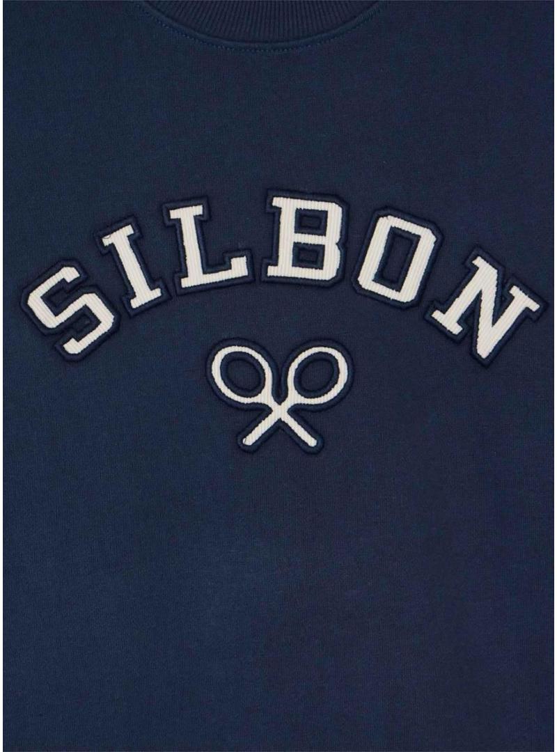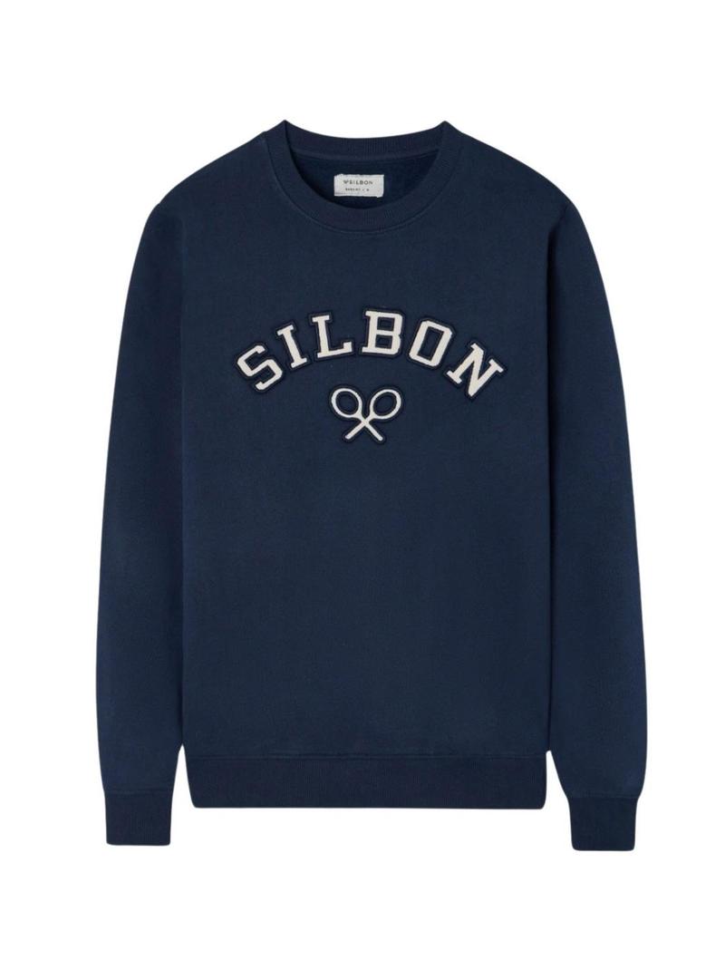 Moletom Silbon. Cor marinho. Formato regular. Gola redonda. Manga comprida. Estampado de letras Silbon e raquetes de pano no peito. O modelo veste o tamanho M.