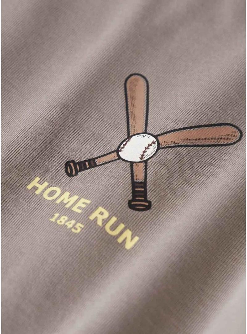 Camiseta Name It. Modelo Mobay. Cor topo. Gola redonda. Manga comprida. Ajuste regular. Ilustração 'Homerun' estampada no peito e nas costas.