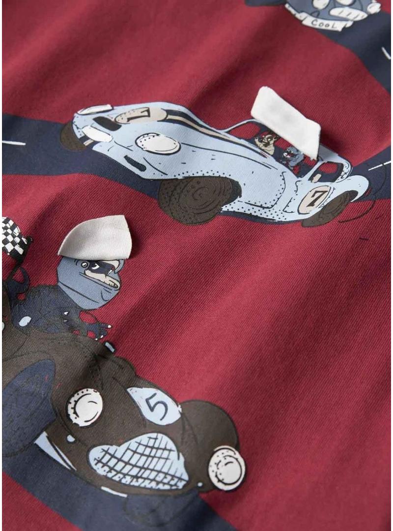 Camiseta Name It. Modelo Rolf. Cor vermelho. Gola redonda. Manga comprida. Ajuste regular. Ilustração de corrida estampada na frente.
