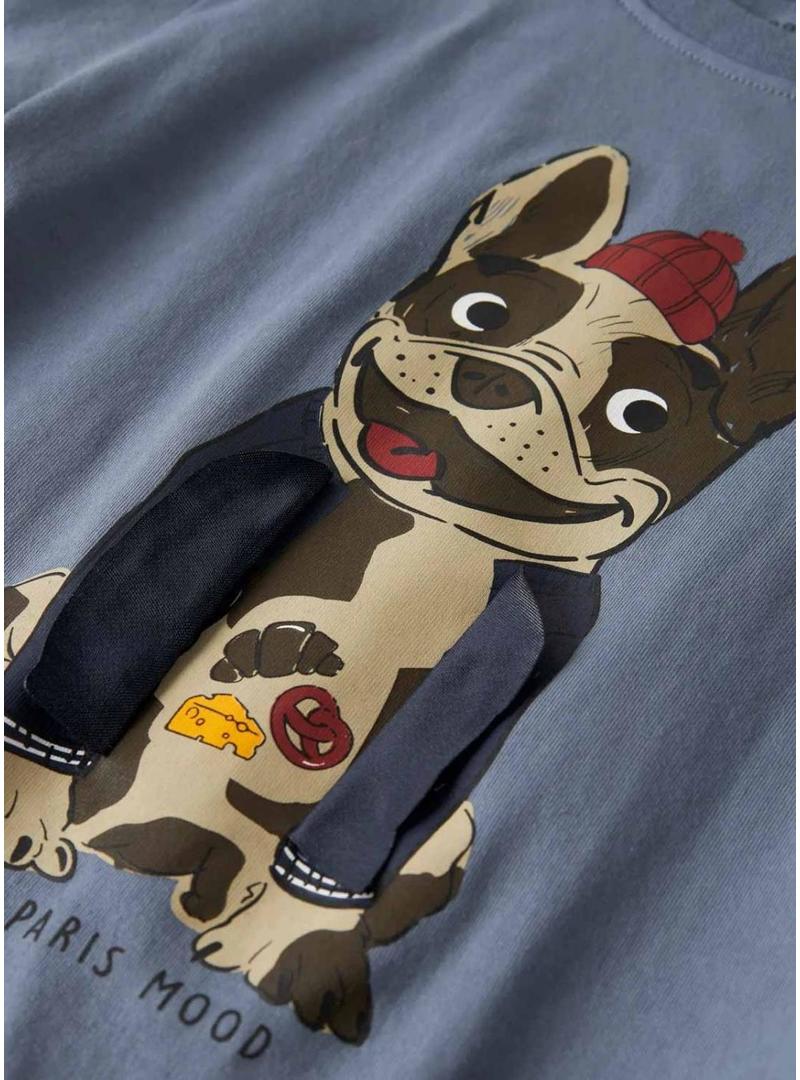 Camiseta Name It. Modelo Rolf. Cor azul. Gola redonda. Manga comprida. Ajuste regular. Ilustração de bulldog francês estampada na parte da frente.