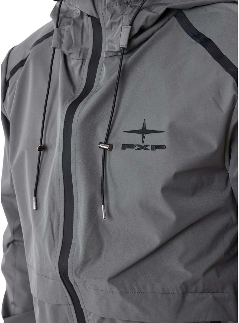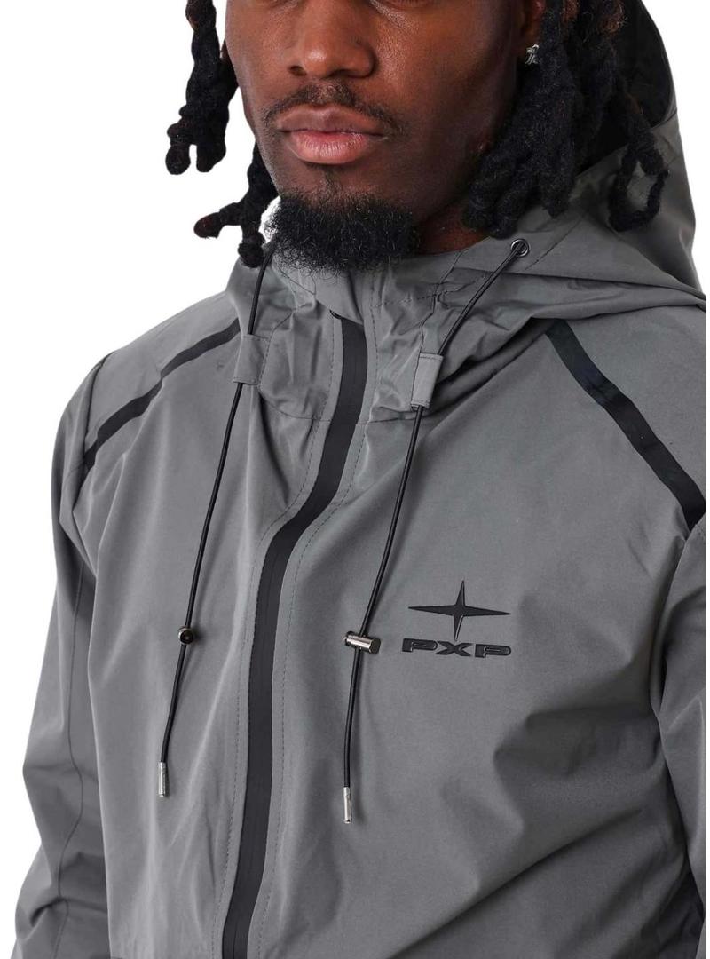 Jaqueta de fato de treino Project x Paris. Cor cinza. Costuras termosseladas. Gola alta. Fecho com zíper. Capuz ajustável. Extremidades elásticas. Bolsos laterais. Bolso na manga. Logo PXP combinando. Tecido leve.
