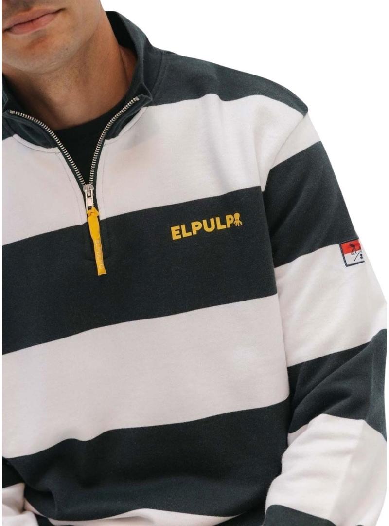 Moletom El Pulpo. Gola alta com zíper. Estampa listrada verde. Feito de algodão orgânico. Print elPulpo no peito. Detalhe de remendo em um braço. Formato regular. O modelo veste tamanho L.