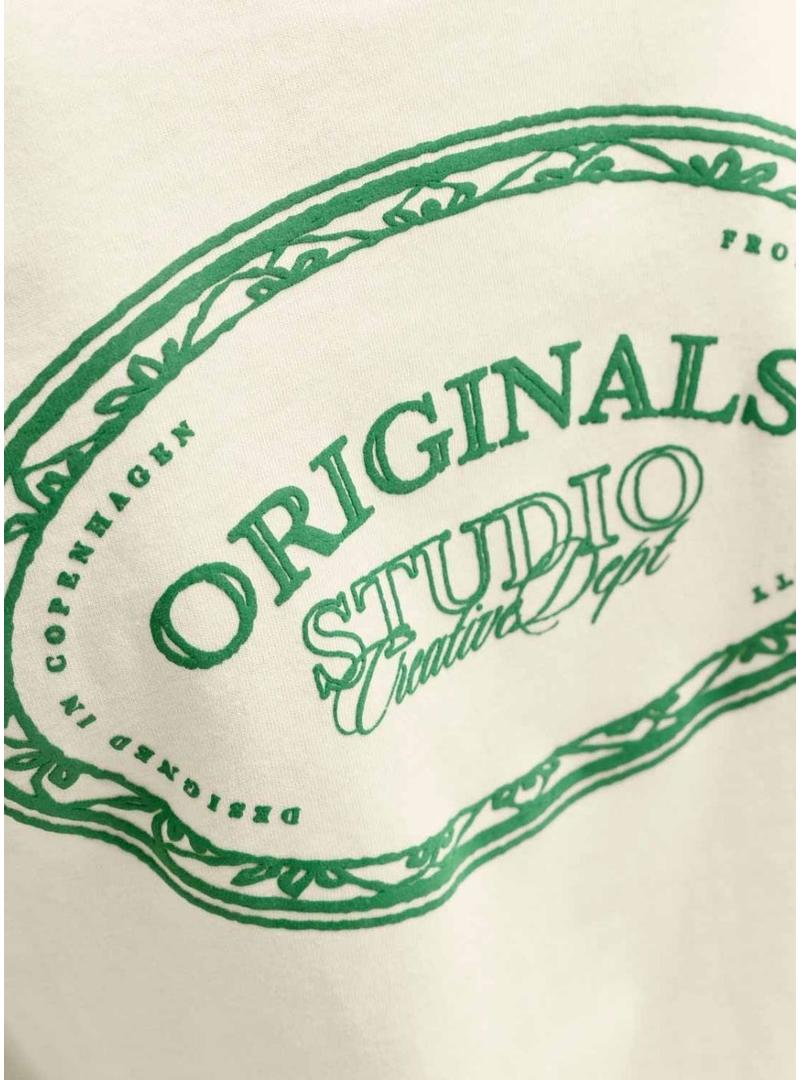 Camiseta Jack and Jones Greene Branding. Cor bege. Gola redonda. Ajuste folgado. Manga curta. Logotipo Originals estampado no peito e nas costas com detalhes em verde.