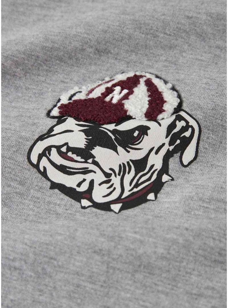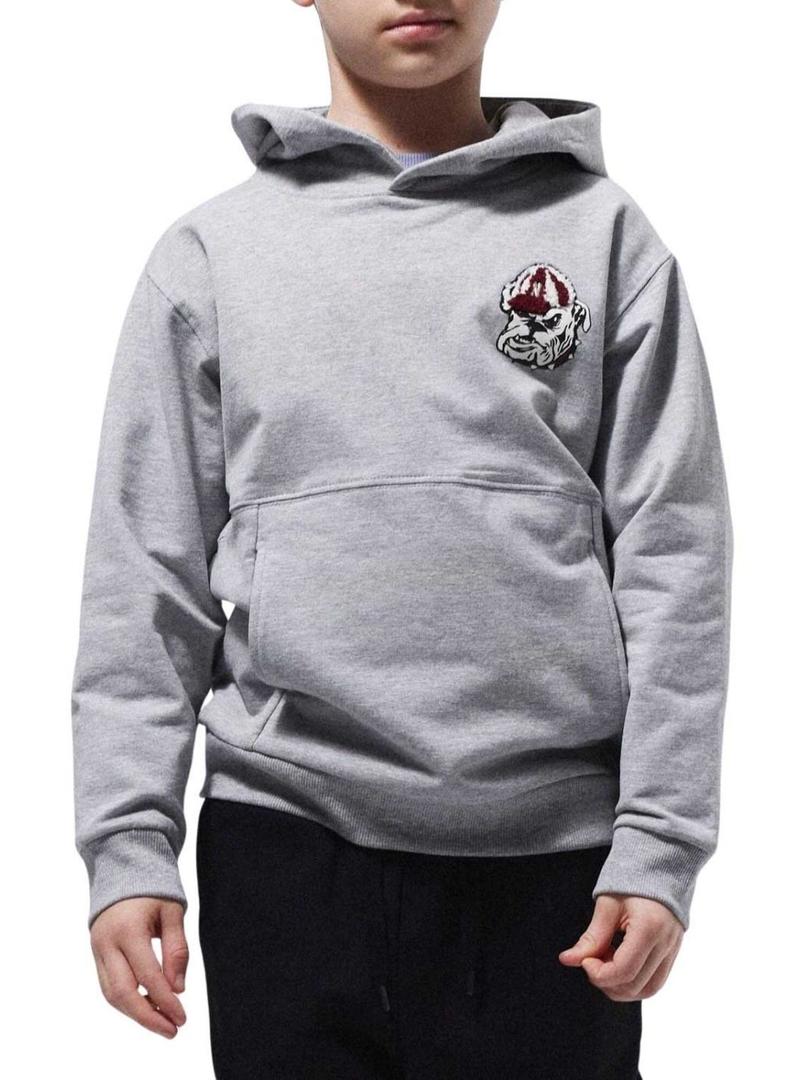 Moletom Name It. Modelo Steven. Cor cinza. Tecido mesclado. Extremos elásticos. Bolso canguru. Ajuste regular. Com capuz. Ilustração de um Buldogue bordado no peito.