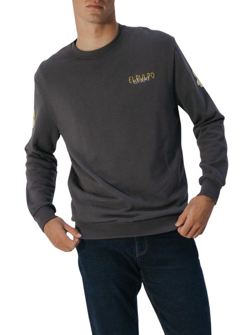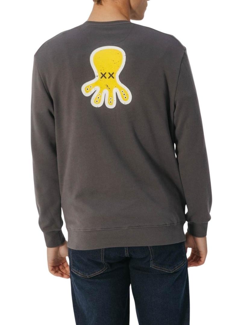 Moletom O Polvo. Cor cinza. Tecido de algodão orgânico. Gola redonda. Manga comprida. Estampa e bordado de O Polvo no peito. Estampa contrastante nas mangas e nas costas. Ajuste regular. O modelo está vestindo o tamanho L.