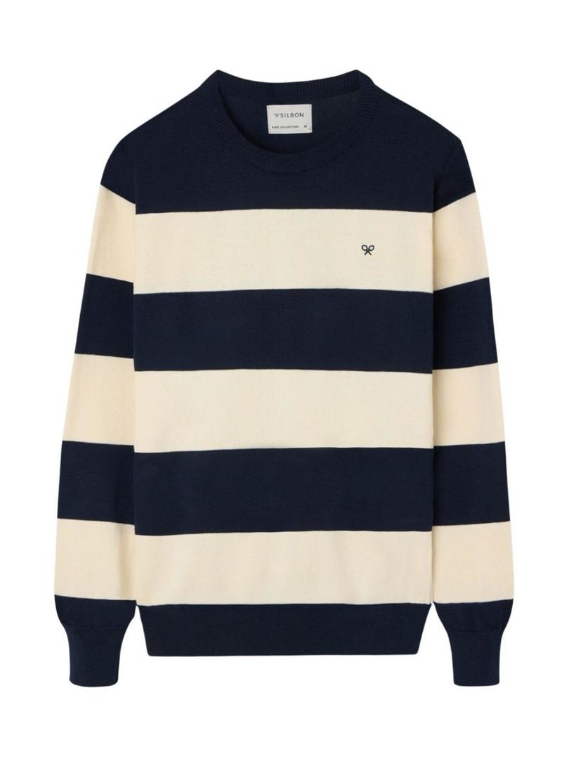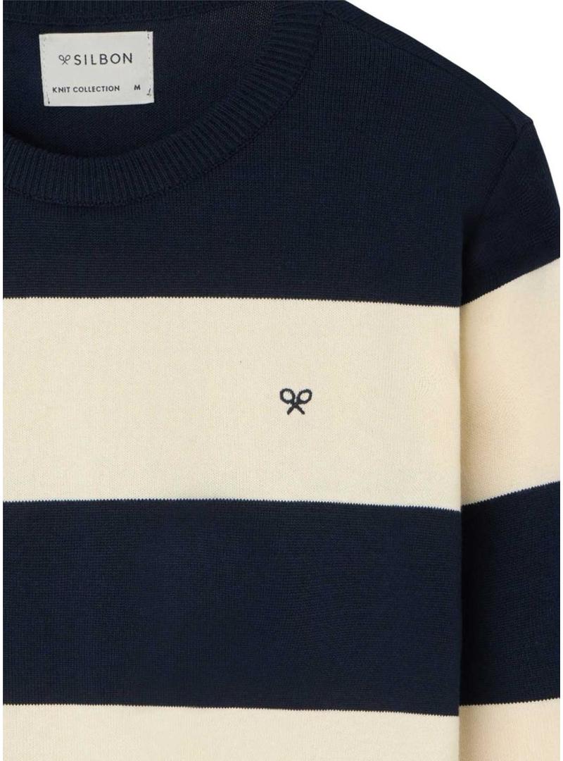 Camisola Silbon. Listras largas azuis. Gola redonda. Bordado de raquetes em contraste no peito. Manga comprida. Acabamentos canelados.