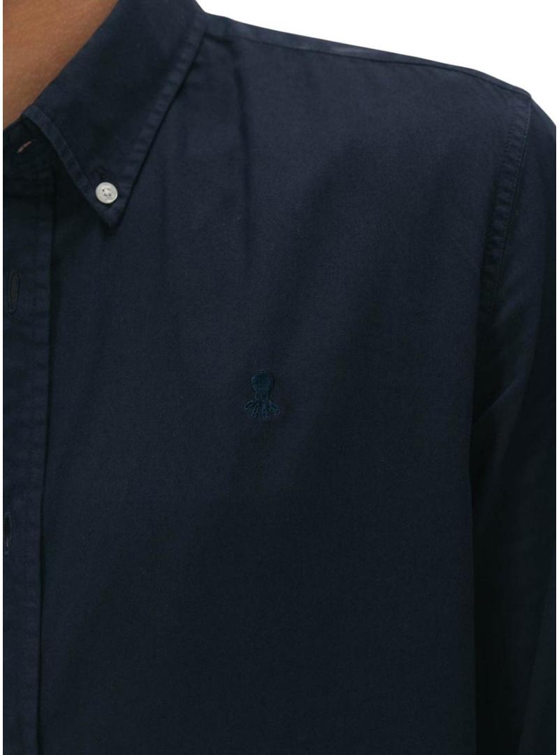 Camisa El Pulpo. Tecido de sarja tingido. Cor azul marinho. Gola com botões. Detalhe do logotipo em tom no peito. Manga comprida. O modelo veste o tamanho L.