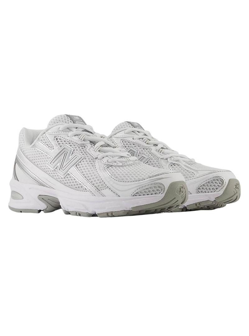 Sapatilhas New Balance. Cor branca. Detalhes em prata. Modelo U740. Parte superior em malha e sintético. Design atemporal. Amortecimento macio. Estas sapatilhas para crianças são uma boa opção para usar o dia todo. Sola Azorb.