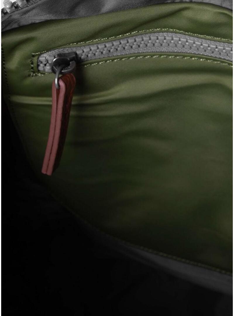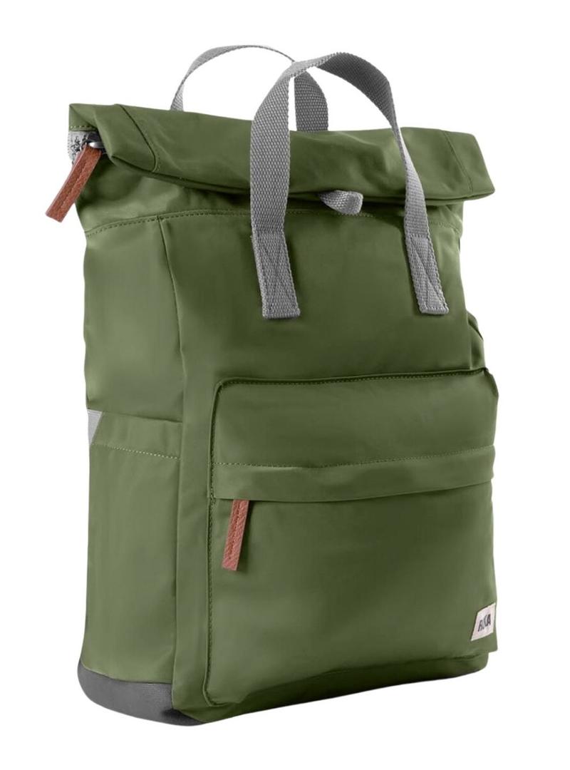 Mochila Roka. Modelo Canfield. Cor verde. Tamanho médio. Fecho enrolável. Abertura ampla. Zíper grosso. Suportes magnéticos. Puxadores de zíper coloridos em contraste. Possui um bolso secreto externo com fecho de zíper. Bolsos internos. Material exterior: Lona reciclada resistente às intempéries. Bolsos laterais para garrafas. Alças de ombro ajustáveis, conforto V-Factor. Alças largas. Tamanho: 42 cm x 30 cm x 12 cm. Capacidade: 15 litros. Vegano. Ideal para guardar um laptop de 15'.