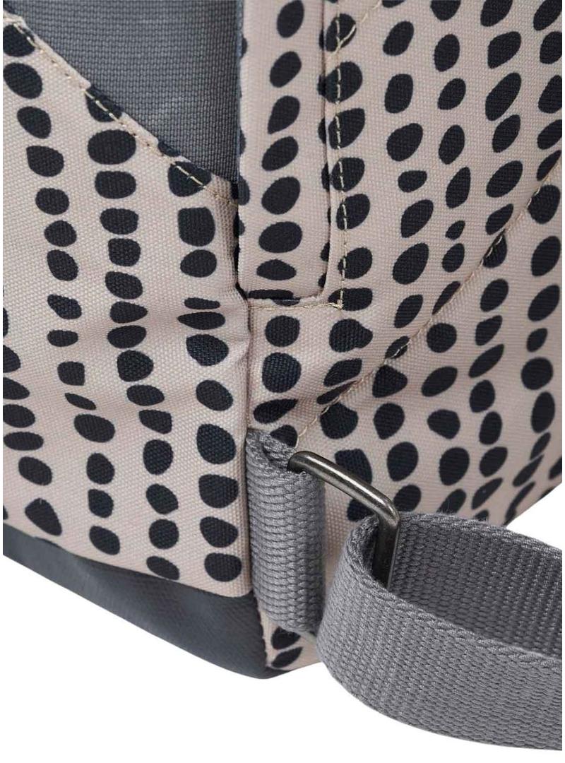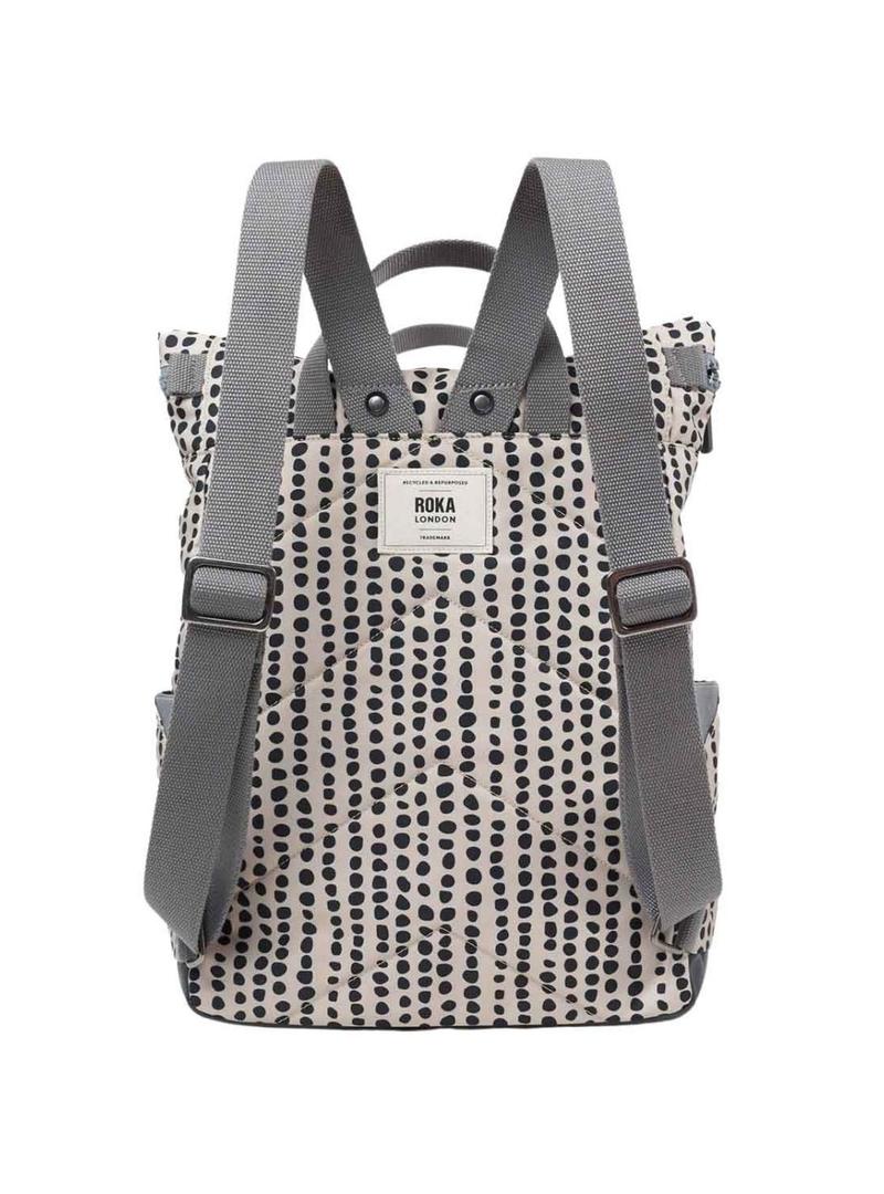 Mochila Roka. Modelo Canfield. Estampa de bolinhas. Tamanho pequeno. Fecho enrolável. Abertura ampla. Zíper grosso. Suportes magnéticos. Possui um bolso secreto externo. Bolsos internos. Material exterior: Lona reciclada resistente às intempéries. Bolsos laterais para garrafas. Alças de ombro ajustáveis, conforto V-Factor. Tamanho: 33 cm x 23,5 cm x 9,6 cm. Capacidade: 7 litros. Vegano.