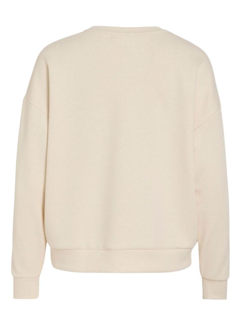 Moletom Vila. Modelo Visiffi. Gola redonda. Cor bege. Bordado no peito. Tecido muito macio. Ombros caídos. Acabamentos elásticos. Corte regular.
