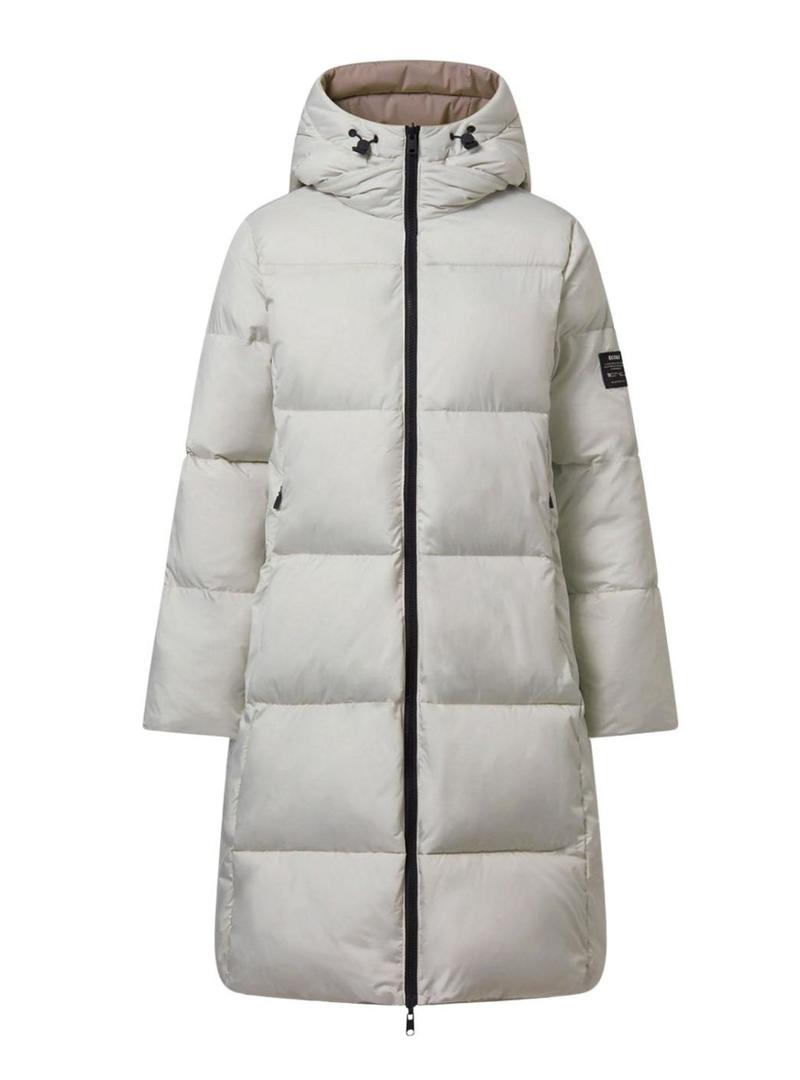 Casaco Ecoalf. Modelo Baru. Modelo reversível. Corte relaxado. Cor branca. Interior tostado. Comprimento abaixo do joelho. Fecho com zíper bidirecional. Bolsos laterais. Com capuz. Estampa da marca no interior. Etiqueta da marca na manga. Repelente à água. Livre de Pfc. O modelo usa o tamanho S.