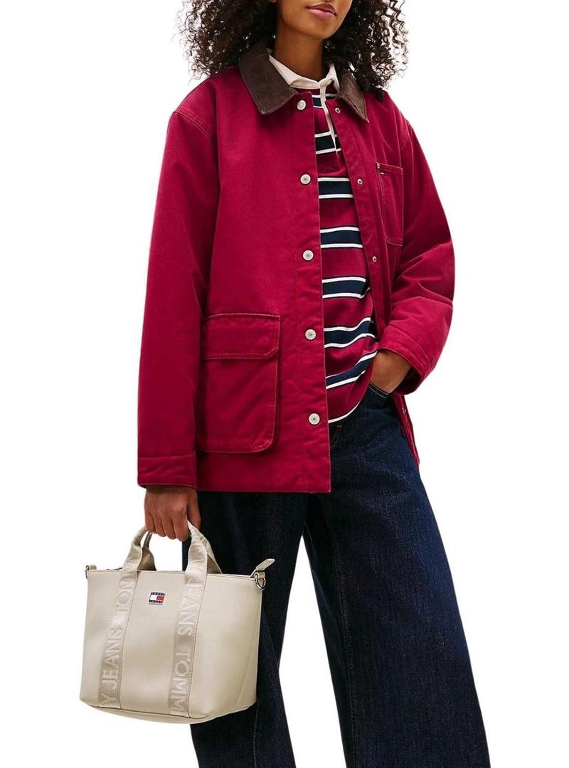 Bolsa Tommy Jeans. Modelo Daily Elevated Mini. Cor bege. Acabamento liso. Compartimento principal com fecho de correr. Duas alças superiores com inscrição Tommy Jeans. Alça de ombro ajustável e removível em tecido trançado. Bolso interior com fecho de correr. Emblema metálico Tommy na parte da frente. Dimensões: 20 x 3 x 15 cm. Capacidade de 7 L.