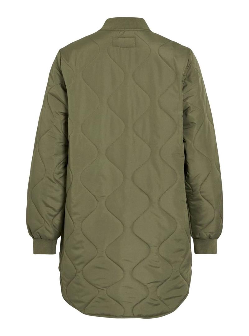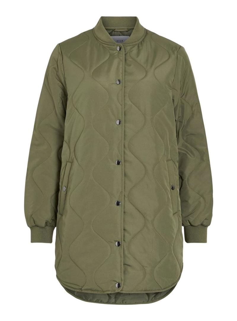 Casaco acolchoado da Vila. Modelo Vitate. Cor verde. Fecho frontal com botões. Dois bolsos com fecho de botões de pressão. Corte regular. Gola e mangas com acabamento canelado. Acolchoado em formato de diamante. Parte de trás mais alongada que a parte da frente.