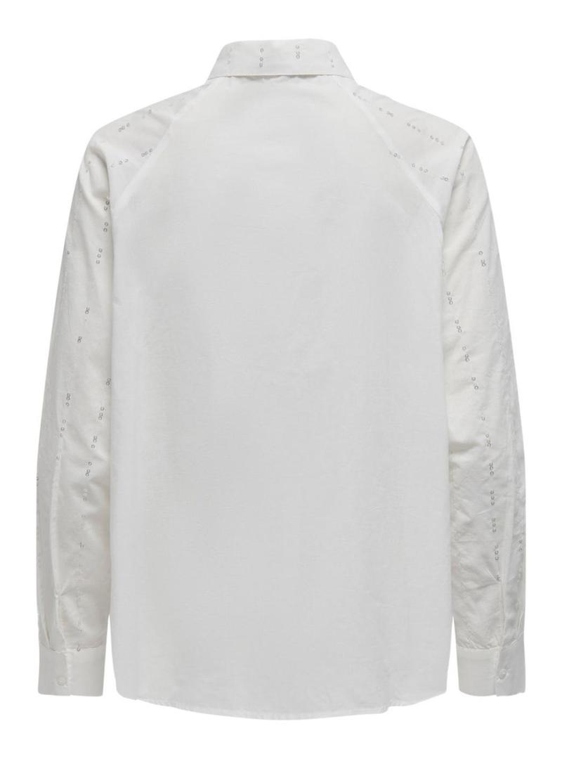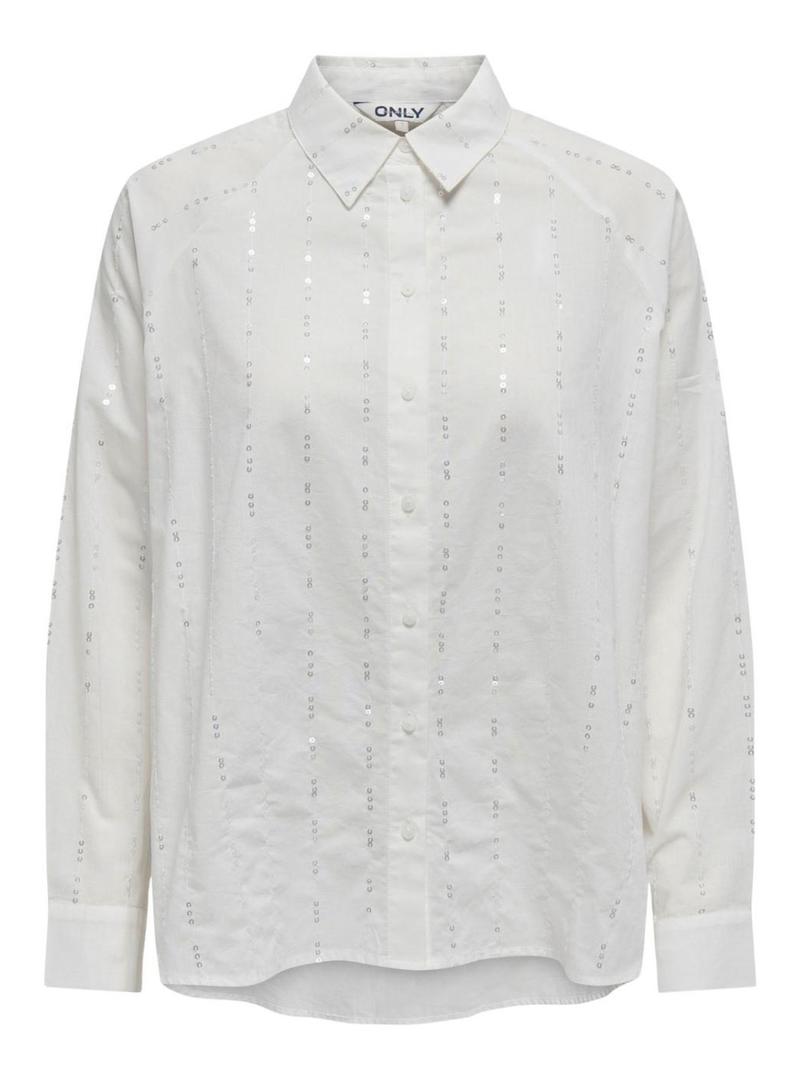 Camisa Only. Modelo Onlminna. Cor branca. Feito de algodão. Colarinho clássico de camisa. Punhos com botões. Fecho de botões. Corte regular. Detalhe de lantejoulas.