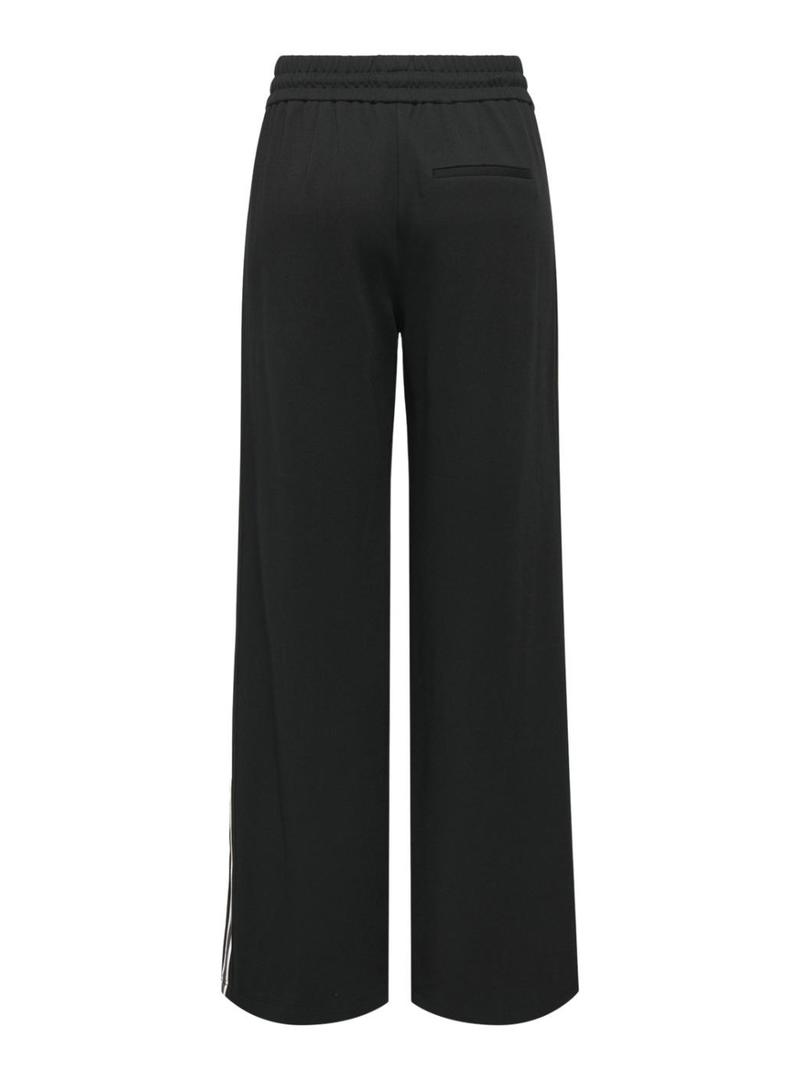 Calça Only. Modelo Poptrash Tadia. Cor preta. Cintura elástica com cordão ajustável. Perna reta. Corte folgado. Faixas decorativas ao longo da perna. Dois bolsos laterais. Um bolso decorativo na parte de trás.