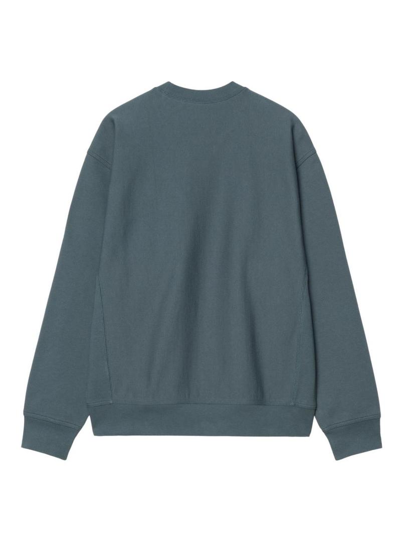 Camisola Carhartt. Modelo American Script. Cor azul. Gola redonda canelada. Feita com uma mistura de algodão e poliéster penteados. Silhueta ampla e folgada. Logotipo bordado no peito. Detalhes bordados sutis. Bordado americano.