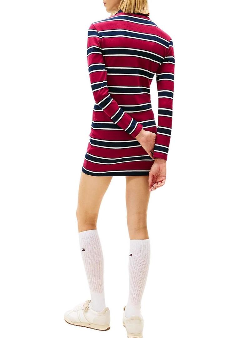 Vestido Tommy Jeans. Modelo Mini Polo. Cor granate, azul marinho e branco. Listras horizontais. Gola polo com três botões. Logo bordado no peito. Tecido levemente elástico. Corte mini. Manga longa.