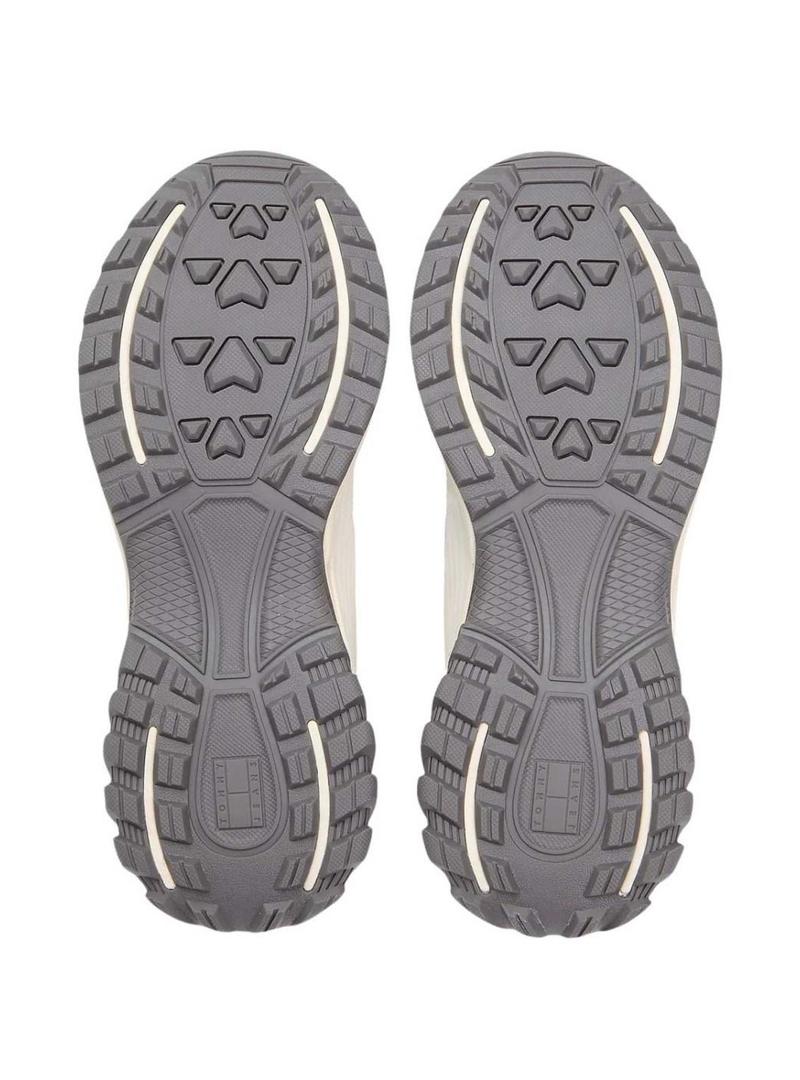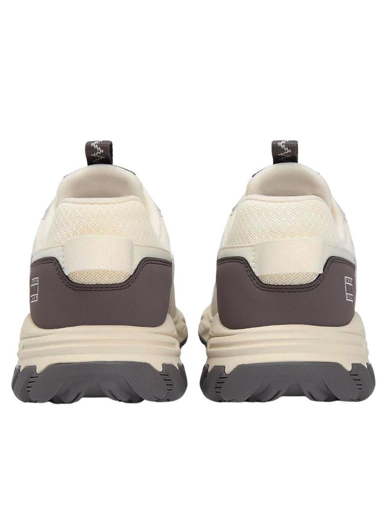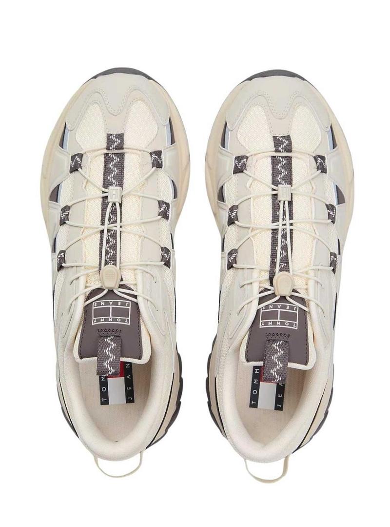 Sapatilhas Tommy Jeans. Modelo Outdoor runner. Cor bege. Detalhes em cinza. Estilo robusto. Exterior em poliuretano com forro de poliéster. Palmilha acolchoada removível de poliuretano. Sola EVA serrilhada antiderrapante com entressola 3D que proporciona estabilidade e amortecimento. Design com painéis de mistura de texturas. Alça traseira. Cordões elásticos ajustáveis com ponta. Remendo Tommy Jeans na lateral e na língua.