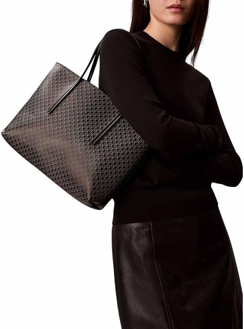 Bolsa Calvin Klein Jeans. Modelo Emblem. Cor preto. Estilo tote. Necessaire removível com zíper. Design com logotipo emblemático em toda a superfície. Alças duplas. Bolso interno com zíper. Altura 22 cm, comprimento 29 cm, largura 9 cm. Queda da alça 18 cm.