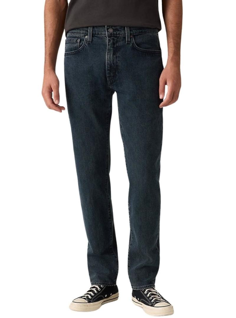 Calça jeans Levi's. Modelo 502. Denim escuro. Cinco bolsos. Fechamento com botão e zíper. Ajuste slim. Corte taper.